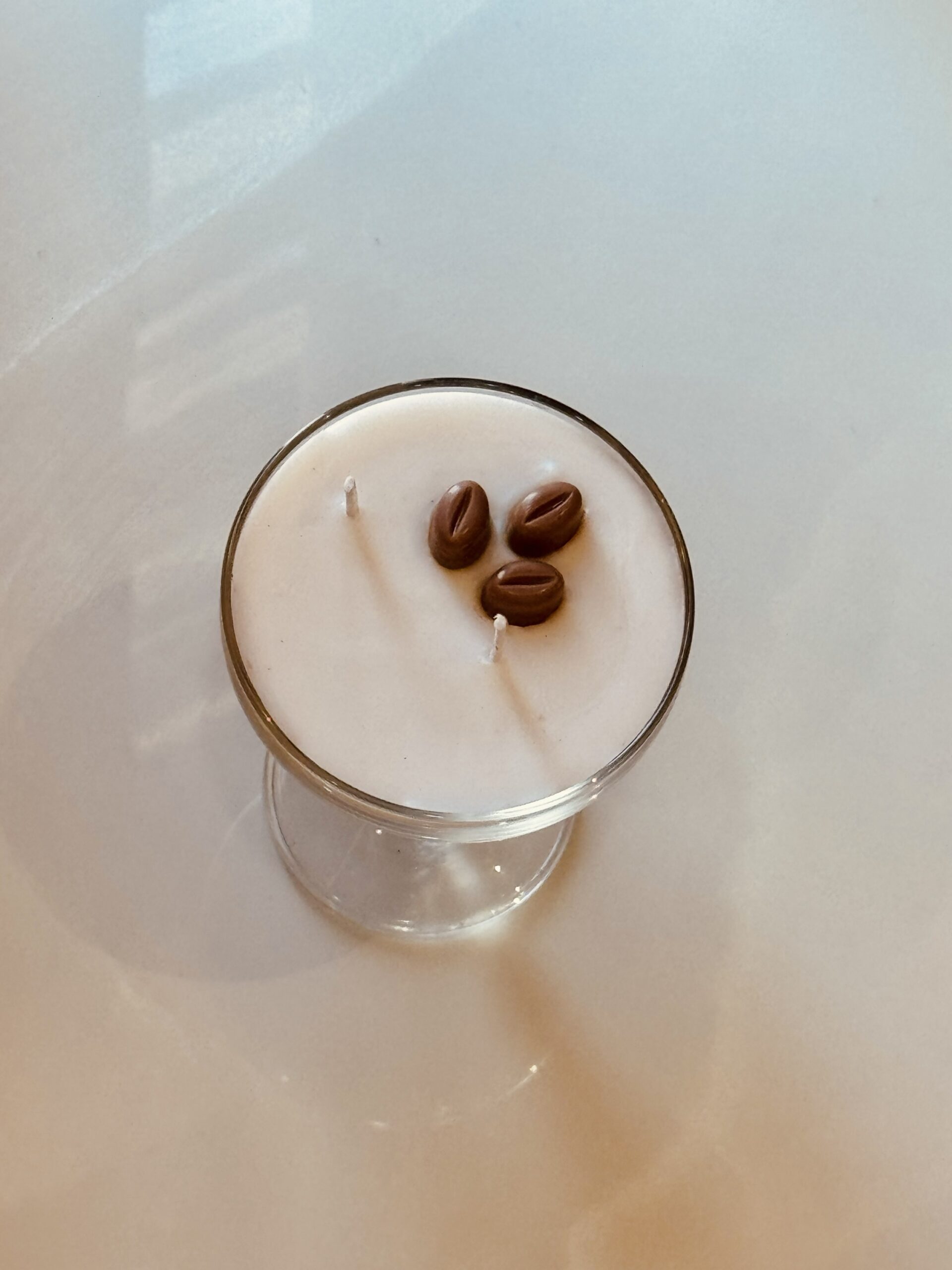 Each piece is finished with hand-placed faux coffee beans on top, adding a charming artisanal touch that makes this candle as beautiful as it is fragrant. The soft glow from the flame reflects through the clear glass stem, creating a sophisticated ambiance perfect for living rooms, bedside tables, and gifting.